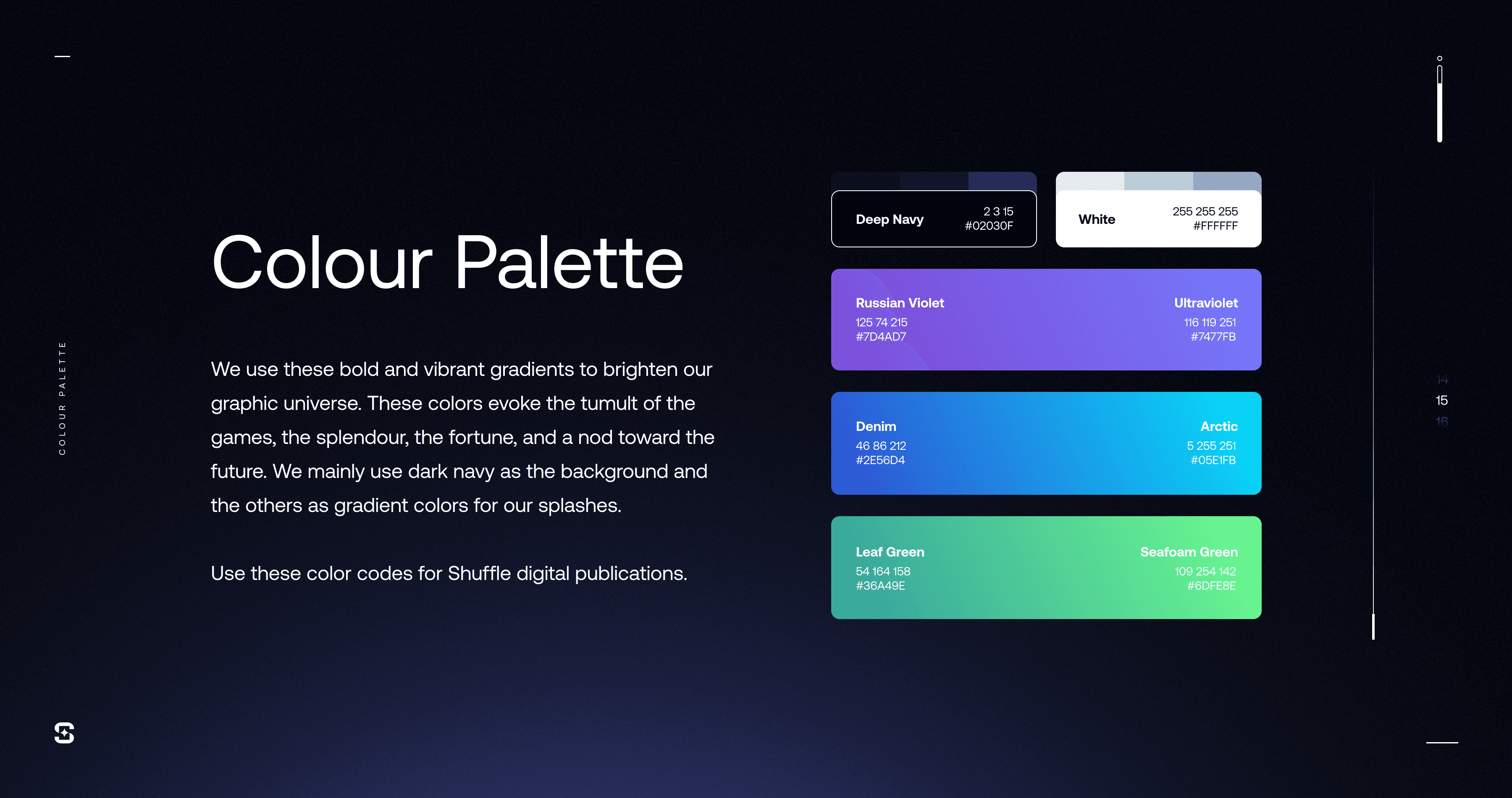 Once a clearer visual path had been paved, I recruited the talented Jehan Fonseka to the Shuffle team as a permanent hire who then hit the ground running developing all required internal graphics. We spent a great deal of time curating visual language for the entire platform tweaking the recipe numerous times until it was perfect. A clear set of rules was then defined so that all collaborators working on the brand could ensure consistency across the board regardless of their role. Documenting correct colour usage, appropriate logo margins and typography may seem simple but ensuring these styles work across all use cases are paramount for a platform as extensive as a casino. Usage across modals, within games, marketing and endless more use cases mean even something as simple as a font needs to work across a variety of applications.